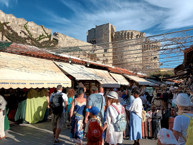 The maze of tourist shops inside the medieval wall at the Marine Gate, by the tourist harbor.