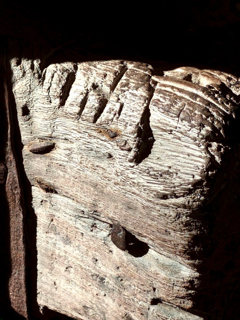 A weathered wooden crossbar on one of the city's medieval gates. The gate dates back more than